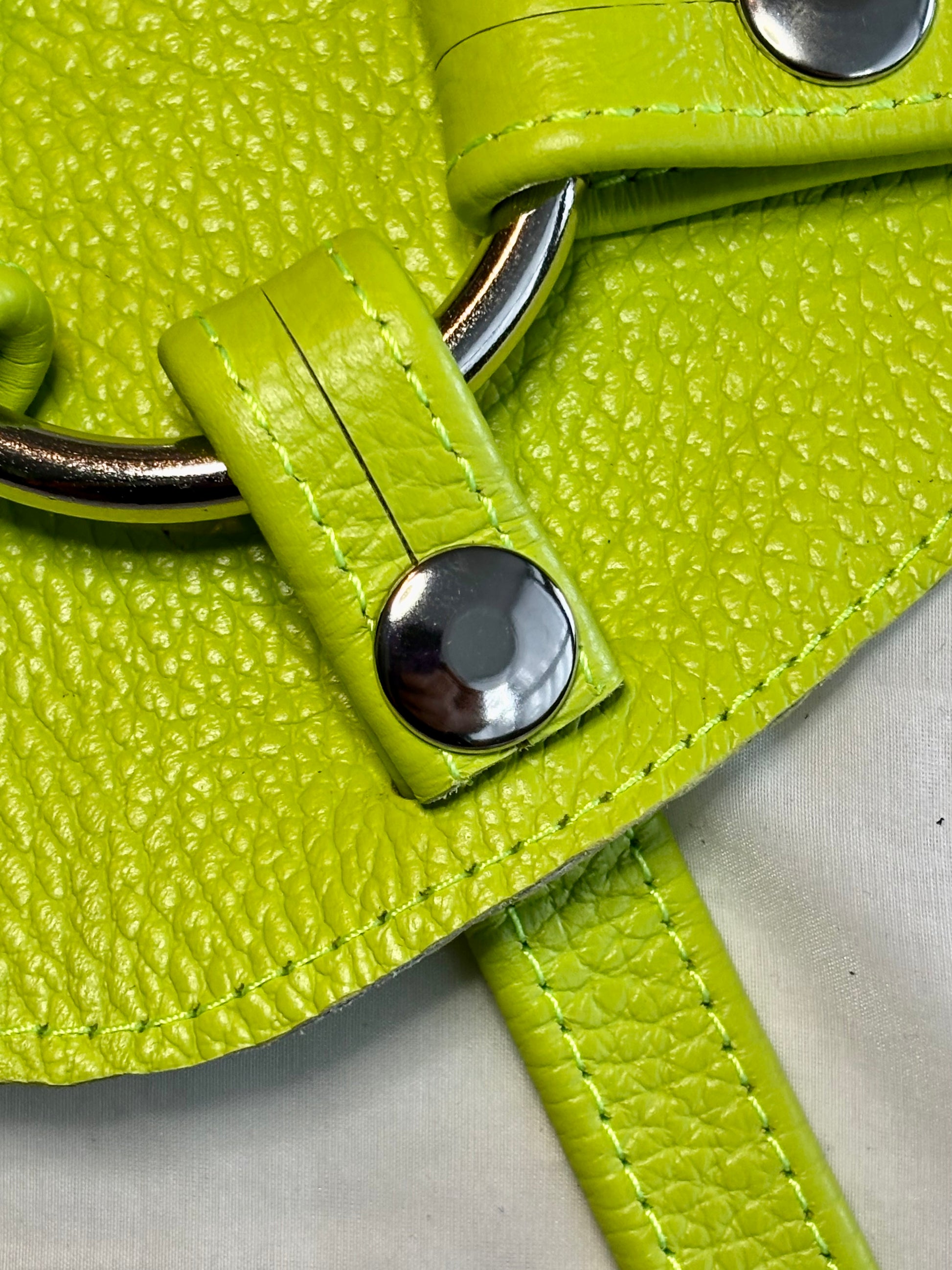 Strap on this acid green leather harness for a secure fit on up to 70' inch hips. Handmade in Canada with pebble grain leather and nickel plate hardware, this inclusive design comes with 2 o'rings and optional custom sizing. Experience the ultimate comfort and control with this high-quality strapon harness.